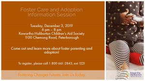 Come join us for a Foster Care & Adoption Information Session on December 3, 2019 from 6-8 pm – KHCAS Peterborough Office, 1100 Chemong Road, Ptbo.