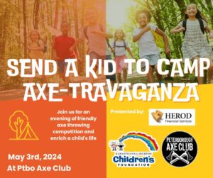 Peterborough, ON – (March 4th, 2024) The Kawartha-Haliburton Children’s Foundation in partnership with Herod Financial Services, and supported by AON, and Kawartha Oral and Maxillofacial Surgery (KOMFS), are excited to announce they are hosting the Send a Kid to Camp AXE-travaganza fundraising event on Friday, May 3rd at the Peterborough Axe Club.