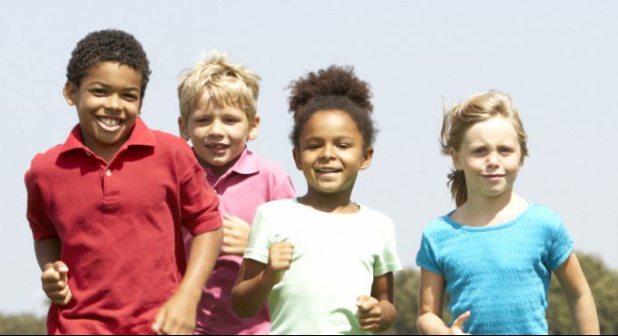 Several children of different ethnic origins wearing summer clothing run in the sunshine.