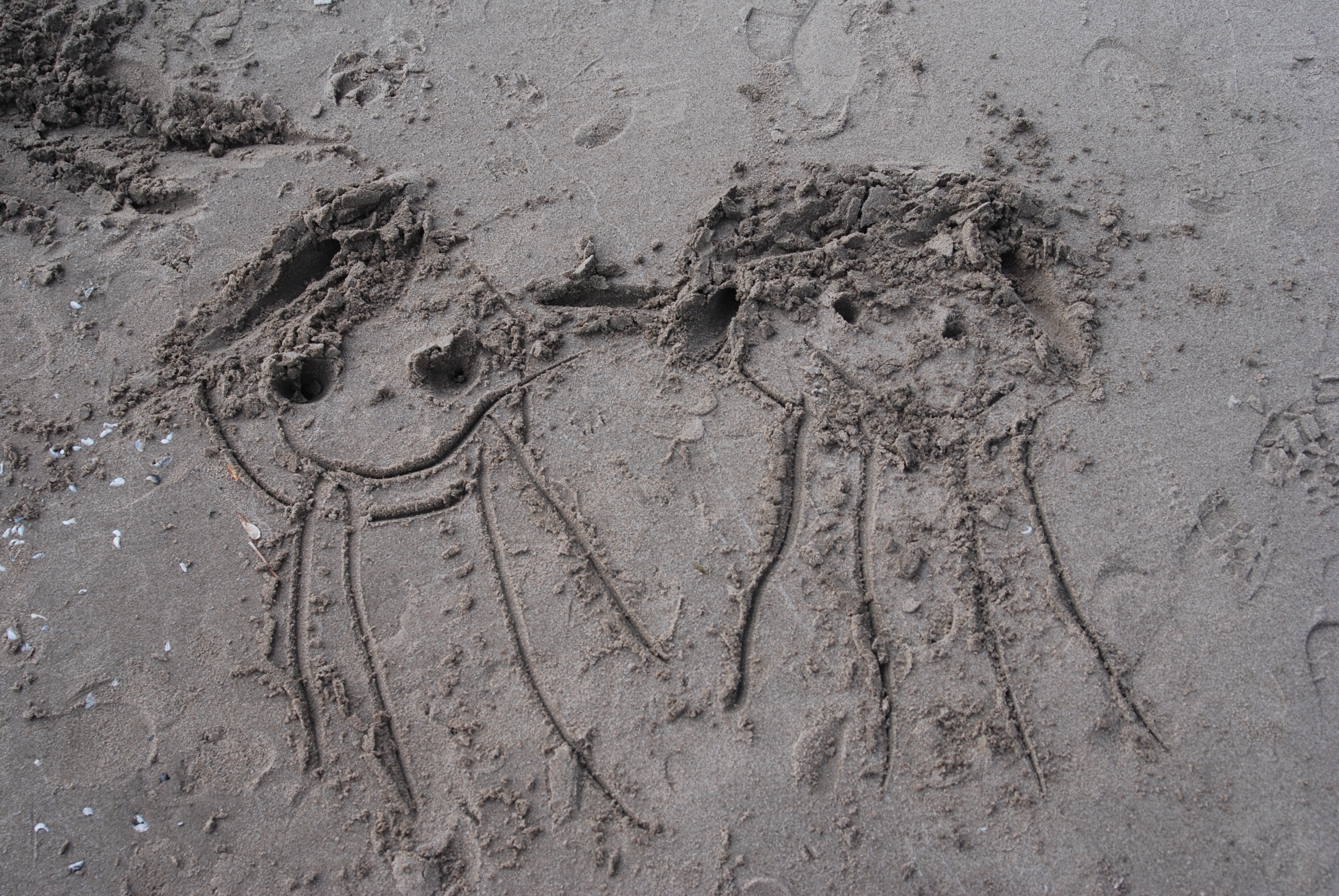 Image of two smiling people with really big heads. They have no bodies, long arms and legs and are drawn in the sand on a beach by a small child (not shown).
