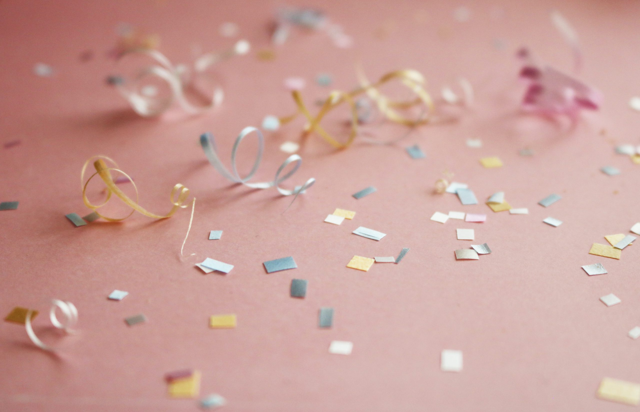 Gold and silver confetti strewn across a pink surface.