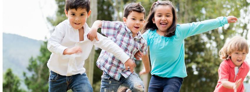 four smiling excited kids running toward the camera on a sunny day wearing light clothing