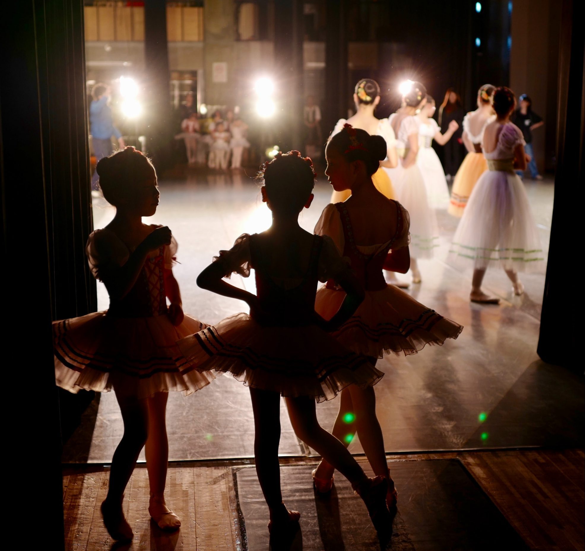 Three little girls in ballerina outfits wait backstage while another group of dancers leave the stage. They are dimly lit.