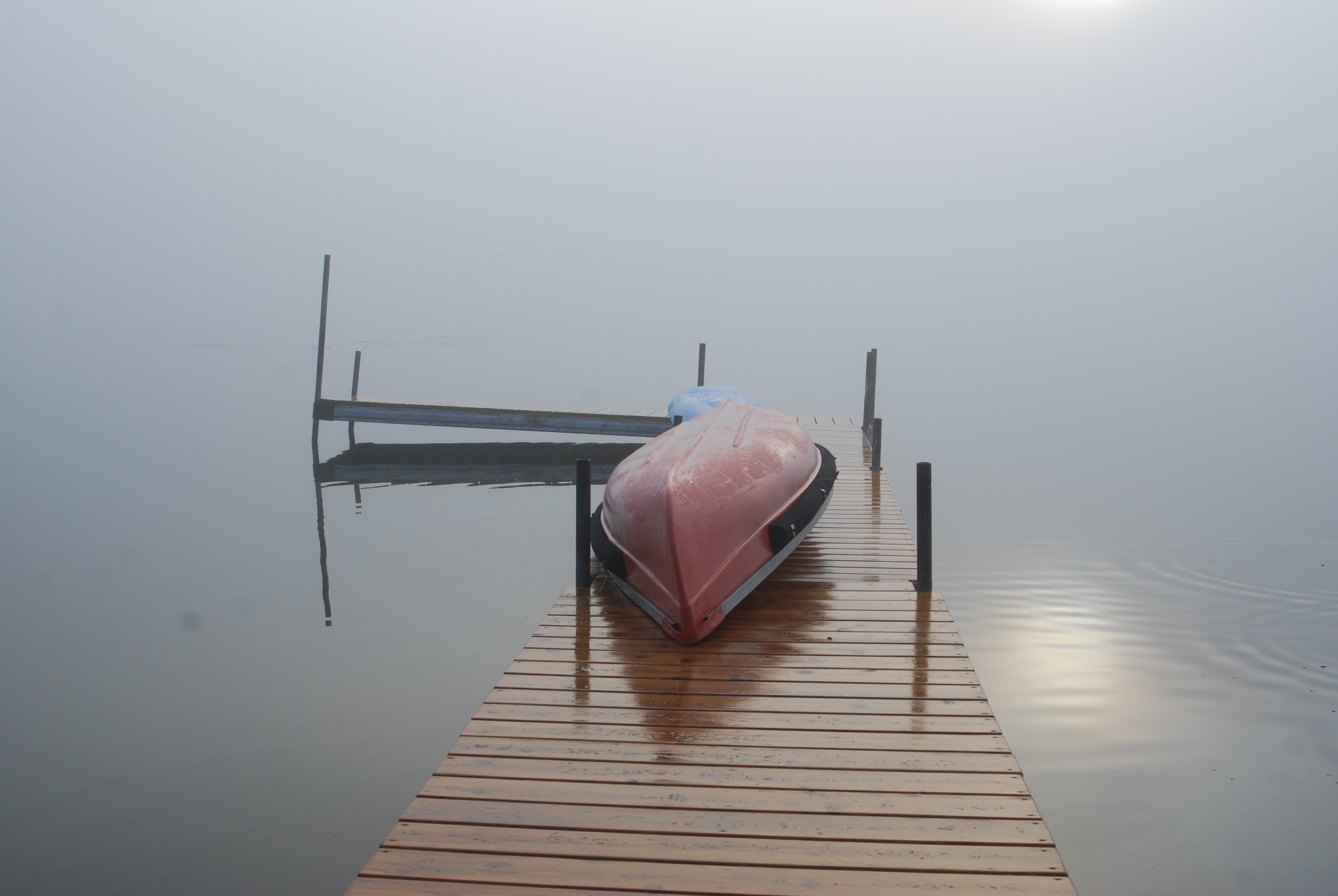 Peaceful misty lake background with foreground of photo featuring an early morning image of a dock and a red canoe.
