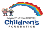 Kawartha-Haliburton Children’s Foundation logo children’s drawing with two children holding hands one wearing pink, one wearing black, both beside a colourful rainbow. Text below reads Kawartha-Haliburton Children’s Foundation.