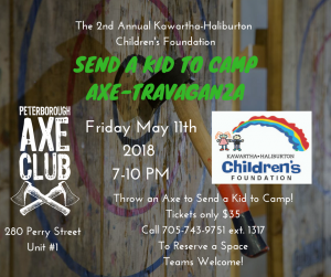 It’s baaaaack! The 2nd Annual Send a Kid to Camp AXE-Travaganza Fundraiser has returned! Come learn the fine art of “chucking steel” with the wonderful staff at the Peterborough Axe Club and help us raise money for a wonderful cause!