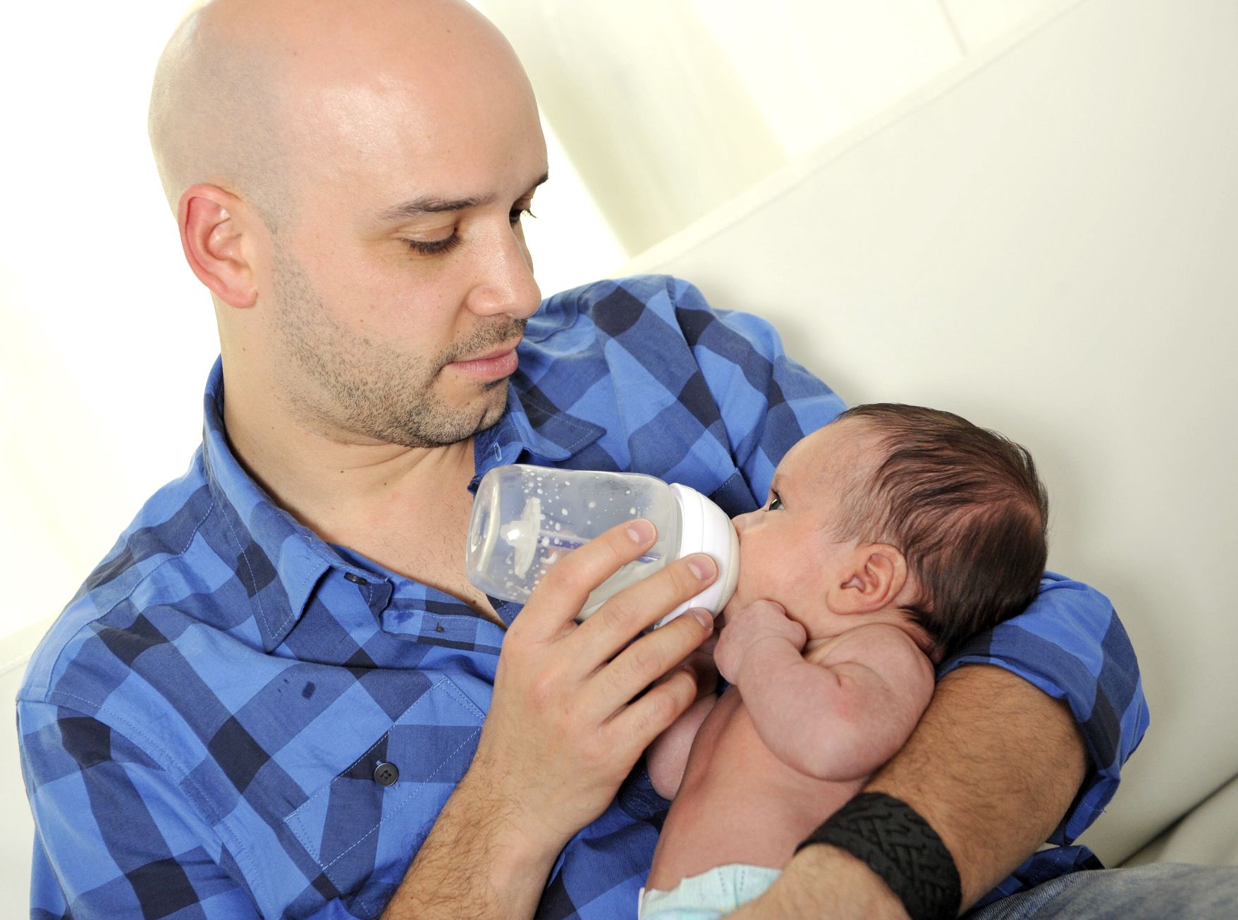young father feeding newborn baby with milk bottle on couch at h